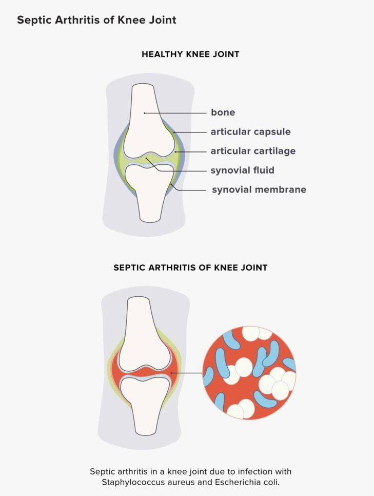 Septic arthritis is an infection in the joint (synovial) fluid and joint tissues. Different types of bacteria, viruses, and fungi can infect a joint. Symptoms include fever, joint pain, swelling, redness, and warmth. Quick treatment with antibiotics is needed to halt the risk of joint damage.