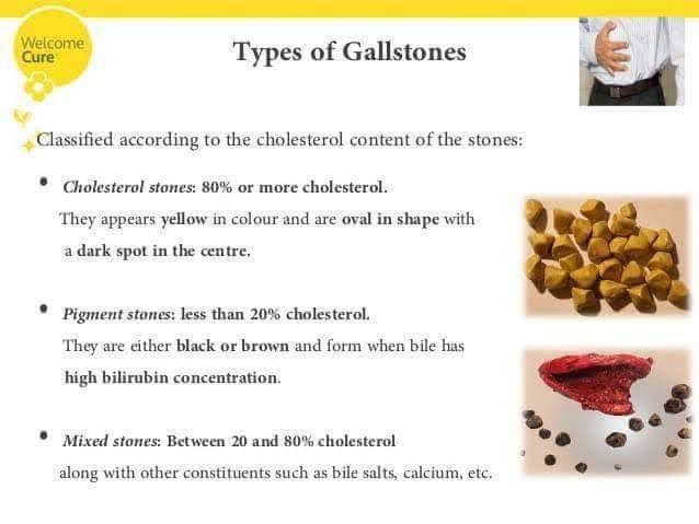 There are three types of gallstones: cholesterol, pigment and mixed stones. All types have their own unique epidemiology and risk factors. Cholesterol stones are yellow-green and are primarily made of hardened cholesterol.