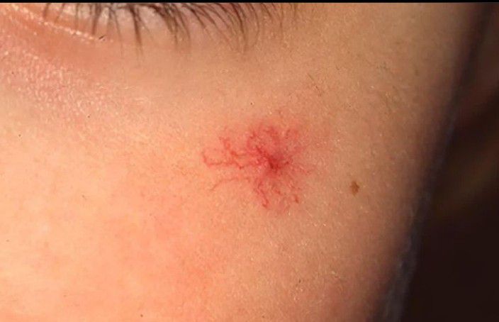 Spider angioma is an abnormal collection of blood vessels near the surface of the skin. Blood used by the body is brought back to the heart and lungs by the veins of the body. Once the blood has gathered more oxygen from the lungs, it is pumped back out to the body through the arteries.