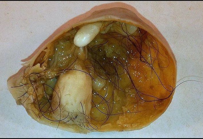 A teratoma is a rare type of germ cell tumor that may contain immature or fully formed tissue, including teeth, hair, bone and muscle. Teratomas may be cancerous or noncancerous, and they can affect people of all ages. Treatment involves surgical removal.