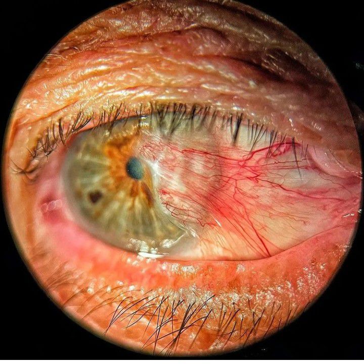 A pterygium, also known as surfer's eye, is a raised, wedge-shaped growth of the conjunctiva that extends onto the cornea — the outer layer of the eye. These growths also can occur on either side of the eye.