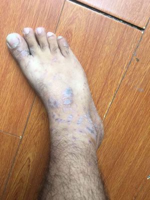 Dx: Lichen planus! Tx topical corticosteroids if localized or adjuvant phototherapy if more generalized.