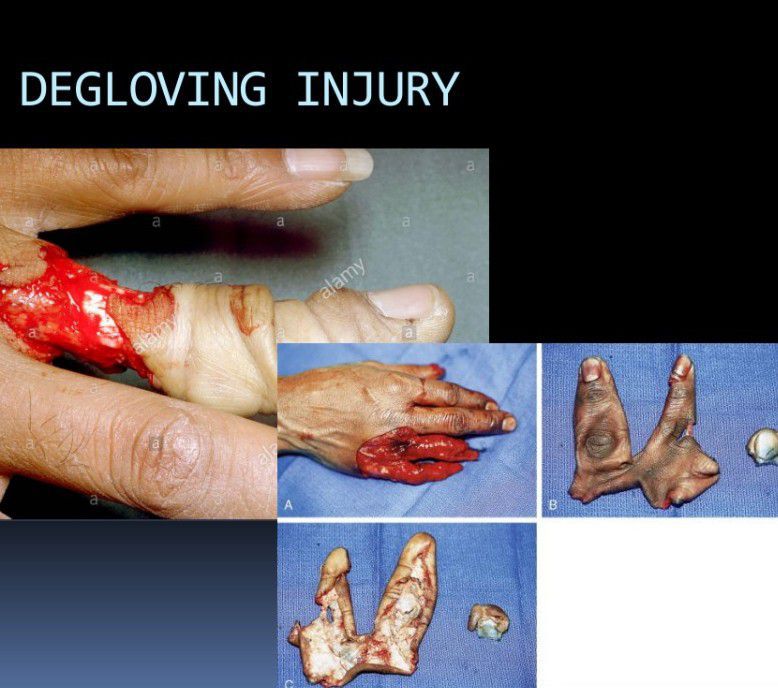 A degloving injury is a traumatic injury that results in the top layers of skin and tissue being torn away from the underlying muscle, connective tissue or bone. They most commonly affect the legs and are frequently associated with underlying fractures.