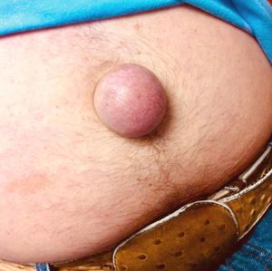 Umbilical hernia is when small intestine or fatty tissue pushes anteriorly-out through the abdomen close to your belly button. •Cause: The weakness may be due to underdeveloped connective tissue or a muscle of the abdomen. In adults, too much abdominal pressure can cause an umbilical hernia. Possible causes in adults include: 1) Obesity. 2) Multiple pregnancies. 3) Fluid in the abdominal cavity (ascites). 4) Previous abdominal surgery. 5) Chronic peritoneal dialysis. •Treatment: umbilical hernia can be treated with surgery to push the bulge back into place and strengthen the weakness in the abdominal wall. The operation may be recommended for your child if the hernia is large or hasn't disappeared by the time they reach four or five years old.