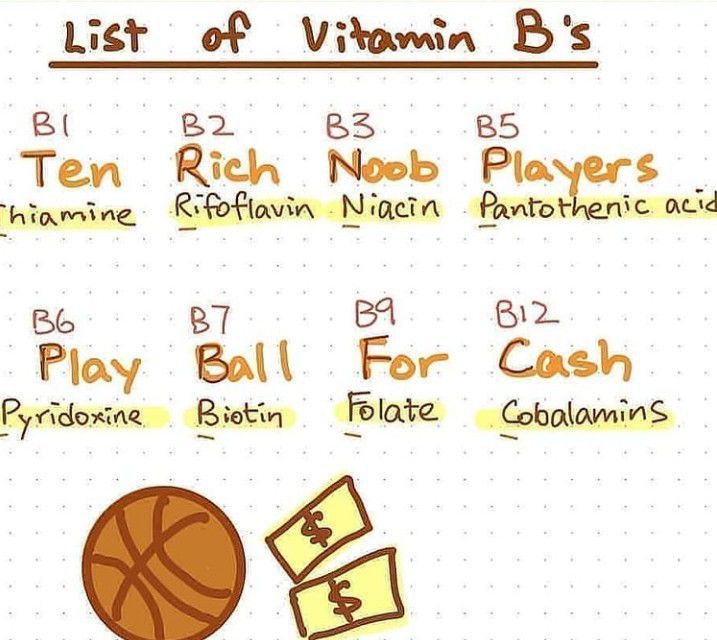 Here is a list of vitamin Bs and mnemonic to remember them all.