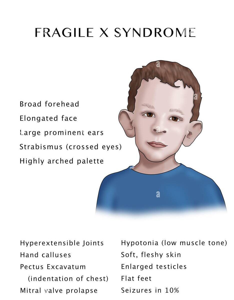 Fragile X syndrome is a genetic condition that causes a range of developmental problems including learning disabilities and cognitive impairment. Usually, males are more severely affected by this disorder than females. Affected individuals usually have delayed development of speech and language by age 2