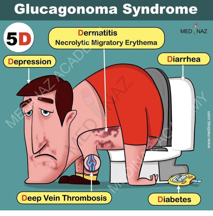 The glucagonoma syndrome is a rare disorder characterized by weight loss, necrolytic migratory erythema (NME), diabetes, stomatitis, and diarrhea. By: https://www.instagram.com/p/CeTUIoUhfIt/?igshid=YmMyMTA2M2Y=