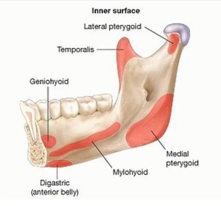 This diagram indicates the muscle origins on the inner surface of the mandible.