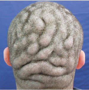 A 21 -year-old man presented with scalp changes that had begun 2 years earlier. Physical examination revealed excessive growth of the scalp, with the formation of convoluted folds and furrows in a cerebriform pattern. The patient had intellectual impairment, although he had no symptoms of neurologic or psychiatric disorders. A 4-mm punch-biopsy specimen from the scalp revealed no inflammatory or neoplastic changes. This clinical presentation was consistent with a diagnosis of cutis verticis gyrata, which is an unusual morphologic condition ofthe scalp characterized by ridges and furrows resembling the brain's surface. No intervention was attempted because the patient had no associated disorders and the condition did not bother him cosmetically. At the 1-year follow-up, there were no changes in the patient's presentation.
