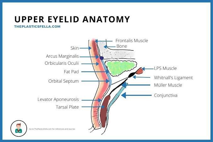 Each eyelid contains a fibrous plate, called a tarsus, that gives it structure and shape; muscles, which move the eyelids; and meibomian (or tarsal) glands, which secrete lubricating fluids. The lids are covered with skin, lined with mucous membrane, and bordered with a fringe of hairs, the eyelashes.