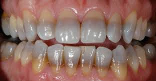 When exposed to tetracycline, a child's newly erupted teeth appear fluorescent yellow. Exposure to sunlight, though, causes a change in color, and the teeth become brownish or grayish over time. Since sunlight affects final tooth color, it's not uncommon to have greater discoloration in the front or anterior teeth.