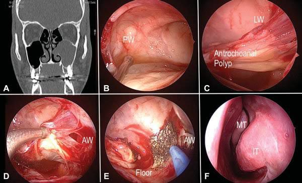 Antrochoanal polyps (ACP) are benign lesions that arise from the mucosa of the maxillary sinus, grow into the maxillary sinus and reach the choana, and nasal obstruction being their main symptom. It is an interesting model to compare the pathophysiological mechanisms with those of bilateral nasal polyposis (NP).