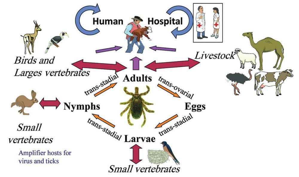 Crimean-Congo haemorrhagic fever (CCHF) in humans is a disease caused by CCHF virus (CCHFV). CCHFV is transmitted by bites from infected ticks (mainly of the Hyalomma genus) or by direct contact with blood or tissues of infected ticks, viraemic patients or viraemic livestock.