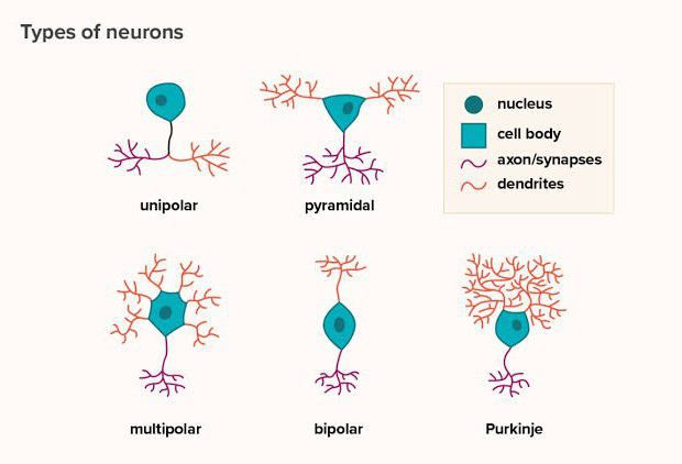 Types of neurons Neurons vary in structure, function, and genetic makeup. Given the sheer number of neurons, there are thousands of different types, much like there are thousands of species of living organisms on Earth. However, there are five major neuron forms. Each combines several elements of the basic neuron shape. Multipolar neurons. These neurons have a single axon and symmetrical dendrites that extend from it. This is the most common form of neuron in the central nervous system. Unipolar neurons. Usually only found in invertebrate species, these neurons have a single axon. Bipolar neurons. Bipolar neurons have two extensions extending from the cell body. At the end of one side is the axon, and the dendrites are on the other side. These types of neurons are mostly found in the retina of the eye. But they can also be found in parts of the nervous system that help the nose and ear function. Pyramidal neurons. These neurons have one axon but several dendrites to form a pyramid type shape. These are the largest neuron cells and are mostly found in the cortex. The cortex is the part of the brain responsible for conscious thoughts. Purkinje neurons. Purkinje neurons have multiple dendrites that fan out from the cell body. These neurons are inhibitory neurons, meaning they release neurotransmitters that keep other neurons from firing.