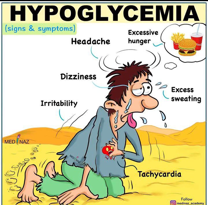 Here you can appreciate the symptoms of hypoglycemia in the form of a pictorial mnemonic. By : https://www.instagram.com/tv/CefknXmjRVr/?igshid=YmMyMTA2M2Y=