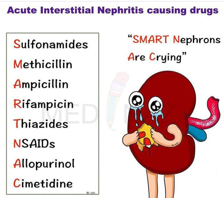 Here you can appreciate the list of drugs which cause acute intestinal nephritis. By: https://www.instagram.com/p/Ceq1ZBgN5EY/?igshid=YmMyMTA2M2Y=