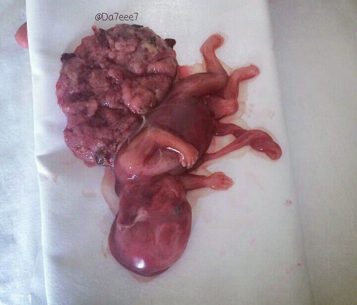 A 16 weeks old fetus with intrauterine-death. Induced and after 15 minutes contractions born in 2 seconds. Clear cause of death; Cord entanglement around his neck . The mechanism of death would not be suffocation as in hanging but compromised blood flow through a tight nuchal cord compressing the vessels. Usually, if the umbilical cord wraps around the neck at birth, it won't hurt the baby. It can cause decelerations during contractions And pushing, But babies have enough reserve to not suffer from this. No other abnormalities visible here.