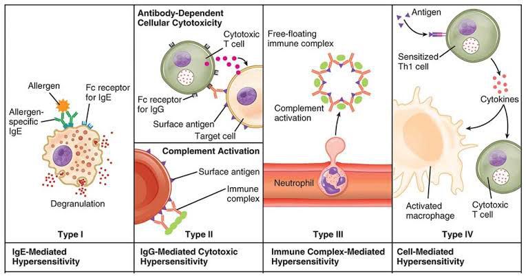 The four types of hypersensitivity are: Type I: reaction mediated by IgE antibodies. Type II: cytotoxic reaction mediated by IgG or IgM antibodies. Type III: reaction mediated by immune complexes. Type IV: delayed reaction mediated by cellular response.