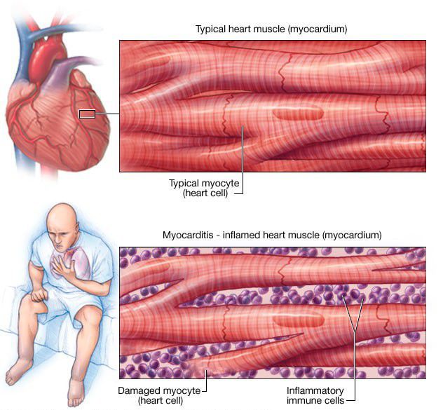 A rare condition in which the heart muscle becomes thick and inflamed and may also become weak. Signs of a viral infection, such as body aches, joint pain, fever, headaches, vomiting, diarrhea or a sore throat. Rapid or abnormal heart rhythms (arrhythmias). Chest pain. Shortness of breath, both at rest and during physical activity.