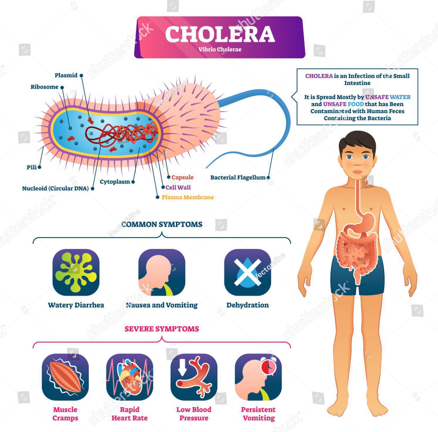 Cholera is an acute diarrheal illness caused by infection of the intestine with Vibrio cholerae bacteria. People can get sick when they swallow food or water contaminated with cholera bacteria. The infection is often mild or without symptoms, but can sometimes be severe and life-threatening.