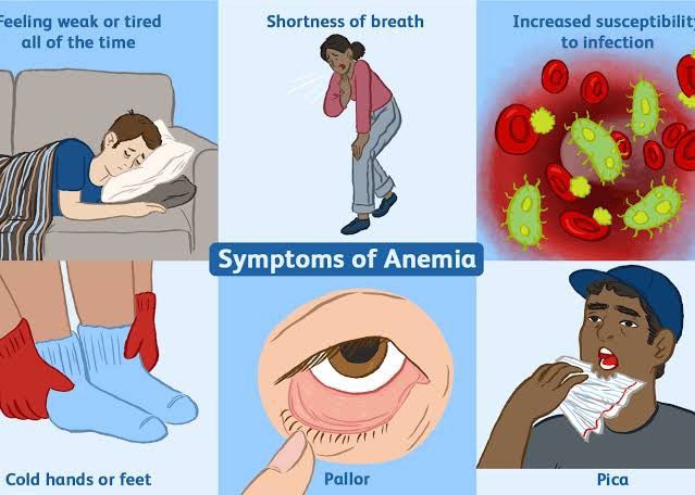 Signs and symptoms, if they do occur, might include: Fatigue. Weakness. Pale or yellowish skin. Irregular heartbeats. Shortness of breath. Dizziness or lightheadedness. Chest pain. Cold hands and feet.