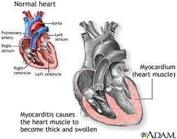 Myocarditis is inflammation of the heart muscle (myocardium). The inflammation can reduce the heart's ability to pump blood. Myocarditis can cause chest pain, shortness of breath, and rapid or irregular heart rhythms (arrhythmias). Infection with a virus is one cause of myocarditis