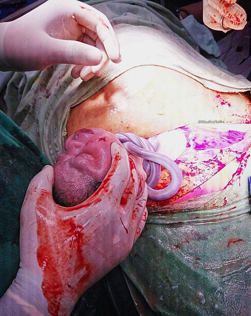 This is a case of a post dated pregnancy in a primigravida. She was taken up for immediate c-section due to abnormal cardiotocography, which showed fetal heart rate tracing abnormalities, specifically abrupt decreases in the heart rate below the baseline of varying depth and duration (variable decelerations). There were four loops of cord seen wrung around the baby’s neck. The baby was cyanotic but survived after the cord has been unwrapped immediately after delivery. She cried after resuscitation and liquor was meconium stained. Both the mother and baby were discharged uneventfully. A loop of umbilical cord around the fetal neck (nuchal cord) is a common finding at delivery and is dangerous when it is wrapped very tightly and compresses the neck 360 degrees. It is caused by movement of the fetus through a loop of cord. In most cases, it is not associated with a significant increase in the rate of any clinically important adverse fetal/neonatal outcome. In others, tight nuchal cords have been associated with adverse outcomes, including lowered blood flow, hypoxia (low oxygen levels), fetal asphyxia and demise. Once delivered, the cord can be unwrapped and left intact to allow the trapped blood and the placental transfusion to return to the baby. Resuscitation with ventilation may be needed while this is taking place over the next 3 to 5 minutes.