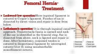 Femoral hernias can be repaired using surgery to push the bulge back into place and strengthen the weakness in the wall of the tummy. Unlike some other types of hernia, treatment of femoral hernias is almost always recommended straight away because there's a higher risk of complications developing in these cases.