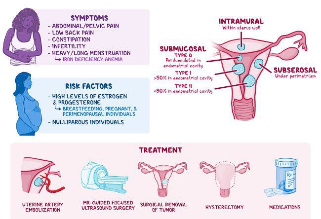 In women who have symptoms, the most common signs and symptoms of uterine fibroids include: Heavy menstrual bleeding. Menstrual periods lasting more than a week. Pelvic pressure or pain. Frequent urination. Difficulty emptying the bladder. Constipation. Backache or leg pains.