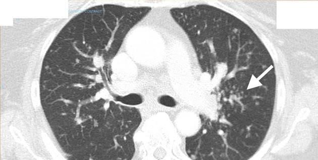 The so-called galaxy sign, initially described as the sarcoid galaxy, represents a coalescent granuloma seen in a minority of patients with pulmonary sarcoidosis . The same appearance can be seen in tuberculosis. In other words, it represents a mass-like region composed of numerous smaller granulomas. The appearance of a central core with peripheral nodules is reminiscent of a globular cluster or galaxy. Central cavitation does occur and the lesions may be surrounded by ground-glass opacity 4. The latter is thought to represent extensive interstitial sarcoid granulomas below the resolution of HRCT rather than alveolitis or hemorrhage