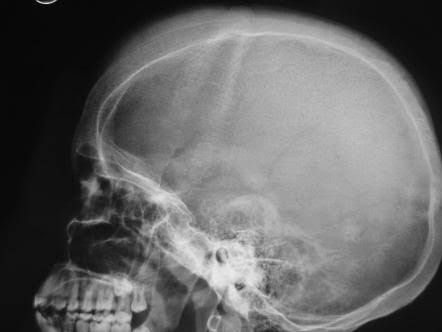 'Hair-on-end' sign is seen in the diploic spaces on the skull radiographs appearing like long, thin vertical striations that resemble hairs standing on ends.. Hair-on-end appearance of the skull is a characteristic feature of chronic hemolysis usually seen in patients with thalassemia and sickle cell anemia.