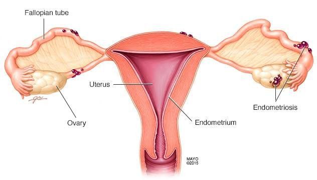 Endometriosis (en-doe-me-tree-O-sis) is an often painful disorder in which tissue similar to the tissue that normally lines the inside of your uterus — the endometrium — grows outside your uterus. Endometriosis most commonly involves your ovaries, fallopian tubes and the tissue lining your pelvis.