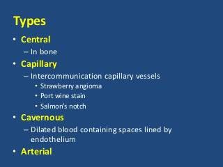 There are three main types: Superficial (on the surface of the skin): These look flat at first, and then become bright red with a raised, uneven surface. Deep (under the skin): These appear as a bluish-purple swelling with a smooth surface. Mixed: These hemangiomas have both superficial and deep components.