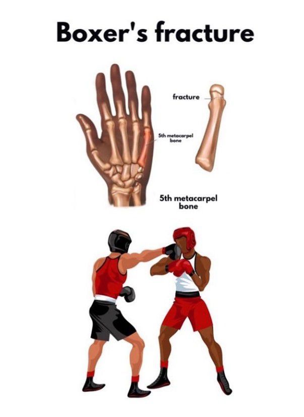 A boxer's fracture is a break in the neck of the 5th metacarpal bone in the hand. It gets its name because the injury is common in inexperienced boxers. The metacarpal bones are the intermediate bones of the hand found inside the flat part of the hand.