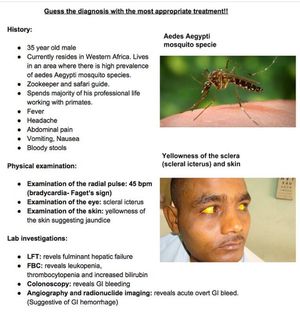 The history is typical... Patient is zookeeper...aedes mosquito is prevalent.. Pointing that patient is at high risk... He is exposed to the vector and the area(western africa) is endemic for yellow fever.. And clinical features are also indicative of the disease...