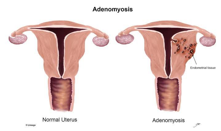 Adenomyosis (ad-uh-no-my-O-sis) occurs when the tissue that normally lines the uterus (endometrial tissue) grows into the muscular wall of the uterus. The displaced tissue continues to act normally — thickening, breaking down and bleeding — during each menstrual cycle.