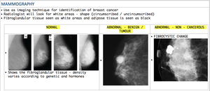Risk factors for breast cancer still remains mystery with many possibilities....... But imaging for cancer at early stage is better for prognosis Fibrocystic is a non-neoplastic proliferation Most common neoplastic breast tumors are fibroadenoma ( benign) , ductal carcinoma & lobular carcinoma ( both are malignant) All of them are adenocarcinoma because they arise from epithelial cells of acini/ glands from lobule of breast