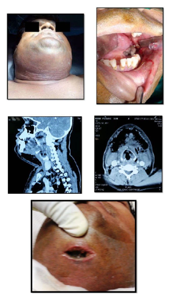 A 51-year-old male, known to be suffering from Type II diabetes mellitus (DM) and hypertension was admitted to the hospital with complaints of pain and swelling in the submandibular region for 3-4 days , together with a high grade fever. Patient had noticed a swelling in the left submandibular region 3- 4 days back with a painful 38. The swelling progressively increased crossing the midline and extending down the neck up to the upper mediastinum. Skin over the swelling was warm, erythematous, and pitting under pressure. The swelling was firm and tender with areas of crackling sensation. Intraorally the floor of the mouth was raised with areas of gangrenous necrosis on the left side medial to 38. The patient had difficulty in breathing and deglutition He was toxic with WBC counts on admission being 27,000, SPO2 was around 92% and temperature was 102 degrees F. Fasting blood sugar was 187mg/dl.Axial and sagittal sections of Computed tomographic scans showed air pockets in the bilateral submandibular and sublingual spaces which was descending along a subcutaneous plane in the neck upto the sternum suggestive of gas gangrene. InjAmikacin 1.5 g and InjMetrogyl 100ml. Culture revealed Ps. aeruginosa and K. pneumoniae. Blood culture revealed K. pneumoniae K. pneumoniae, while urine culture grew Pseudomonas and E. coli. No anerobes were seen to grow in any of the blood or urine cultures. The antibiotics were continued for three weeks.The swelling reduced and clinical signs subsided within 2 weeks. By: https://www.gavinpublishers.com/article/view/gas-gangrene-in-the-neck-caused-by-an-odontogenic-infection-a-case-report