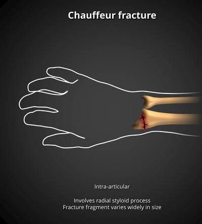 A chauffeur fracture happens when the end of the radius bone (radial styloid process) in your forearm breaks. Chauffeur fractures occur from trauma because of falls, accidents or sports injuries. Providers can treat your broken bone with a cast, external fixation device or surgery.