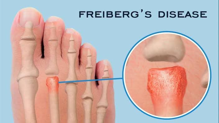 Freiberg disease is avascular necrosis of the metatarsal head. Pain is most pronounced with weight bearing. Diagnosis is confirmed with x-rays. Treatment includes corticosteroid injections, immobilization, and orthotics