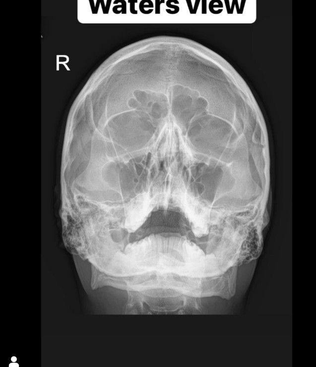 Waters' view is a radiographic view of the skull. It is commonly used to get a better view of the maxillary sinuses. An x-ray beam is angled at 45° to the orbitomeatal line. The rays pass from behind the head and are perpendicular to the radiographic plate.
