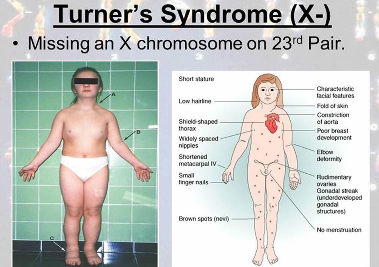 Turner syndrome, a condition that affects only females, results when one of the X chromosomes (sex chromosomes) is missing or partially missing. Turner syndrome can cause a variety of medical and developmental problems, including short height, failure of the ovaries to develop and heart defects.