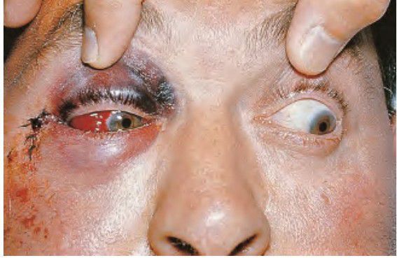 Fracture of the zygoma is often associated with subconjunctival hemorrhage. There is no posterior border to the hemorrhage in this example as the patient look away from the side of fracture.