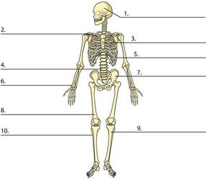 1-le crâne 2-la clavicule 3-le sternum 4-la colonne vertébrale 5-la cote thoracique 6-le radius 7-la crête iliaque 8-le fémur 9-tibia 10-fibula