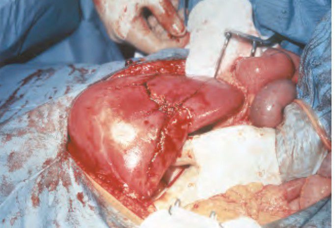 Here you can see a case of a compression injury to the liver, bursting the liver substance.