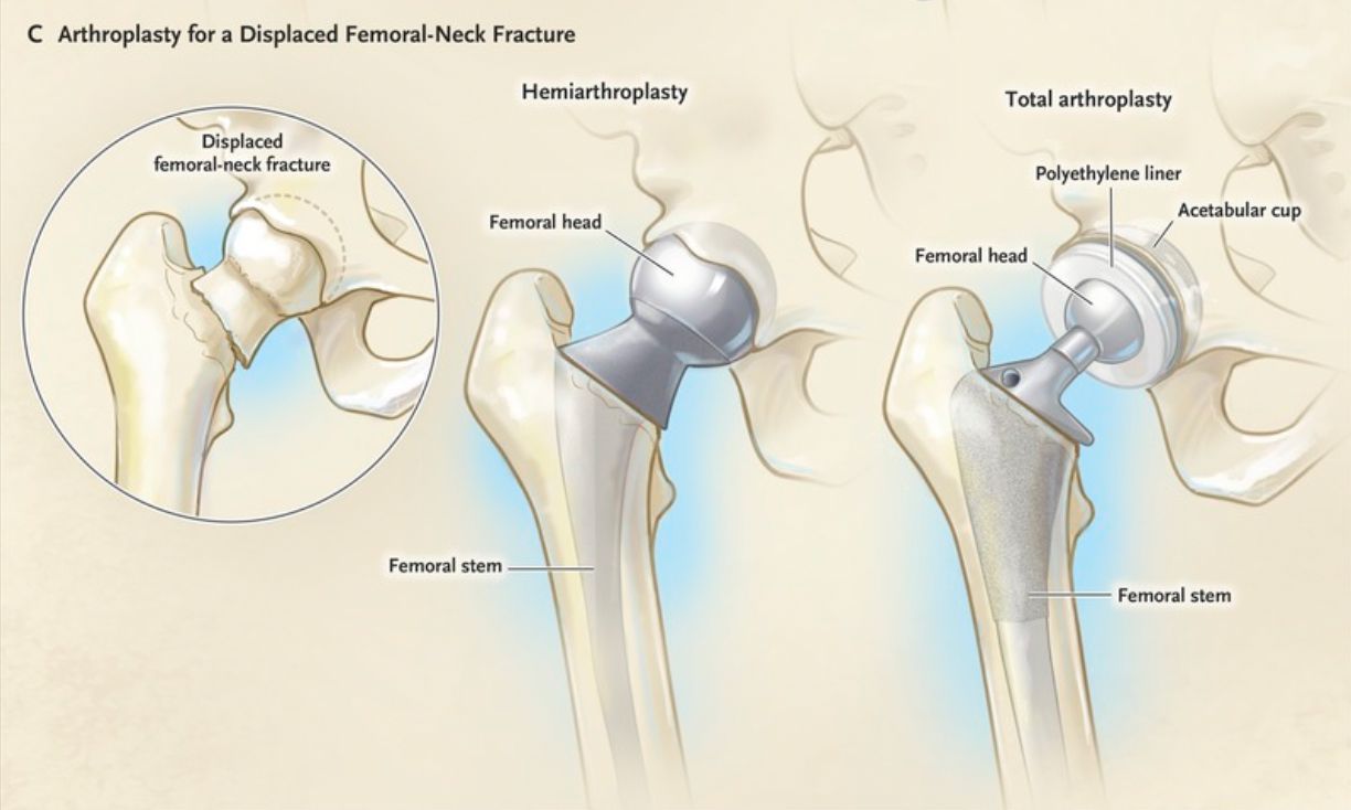 This is an incredible pictorial representation of two different types of arthoplasty treatment for a displaced femoral neck fracture.
