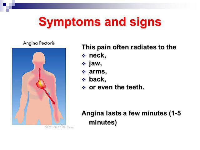 Angina is a server sort of chest pain and the signs symptoms included are pain radiation from chest to left shoulder and areas around nack and jaws angina lasts for few minutes but the pain is severe in nature