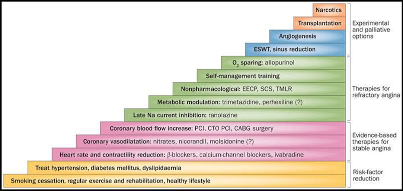 Medications to treat angina may include: Nitrates. Nitrates are often used to treat angina. ... Aspirin. ... Clot-preventing drugs. ... Beta blockers. ... Statins. ... Calcium channel blockers. ... Other blood pressure medications. ... Ranolazine (Ranexa).