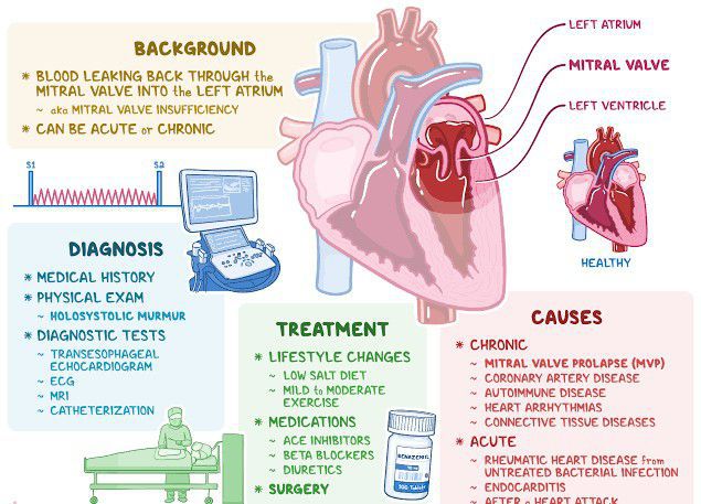 Mitral regurgitation is a disorder in which the mitral valve on the left side of the heart does not close properly. Regurgitation means leaking from a valve that does not close all the way. The external structures of the heart include the ventricles, atria, arteries and veins.