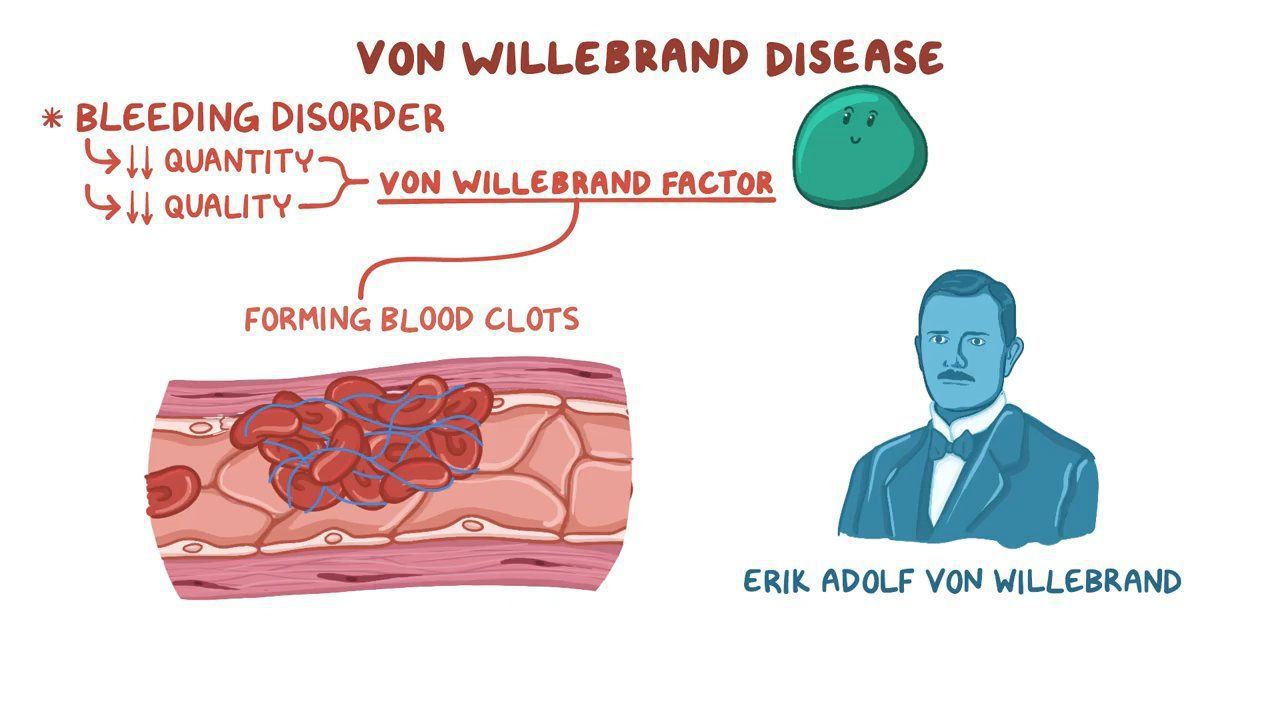 Von Willebrand disease is a lifelong bleeding disorder in which your blood doesn't clot properly. People with the disease have low levels of von Willebrand factor, a protein that helps blood clot, or the protein doesn't perform as it should